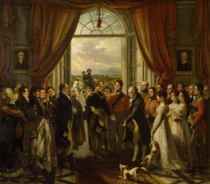 Phillips, Thomas, 1770-1845; The Allied Sovereigns at Petworth, 24 June 1814 (George, 1751-1837, 3rd Earl of Egremont, with His Children Looking on, is presented by George, Prince Regent, to Tsar Alexander I of Russia in the Marble Hall at Petworth with th