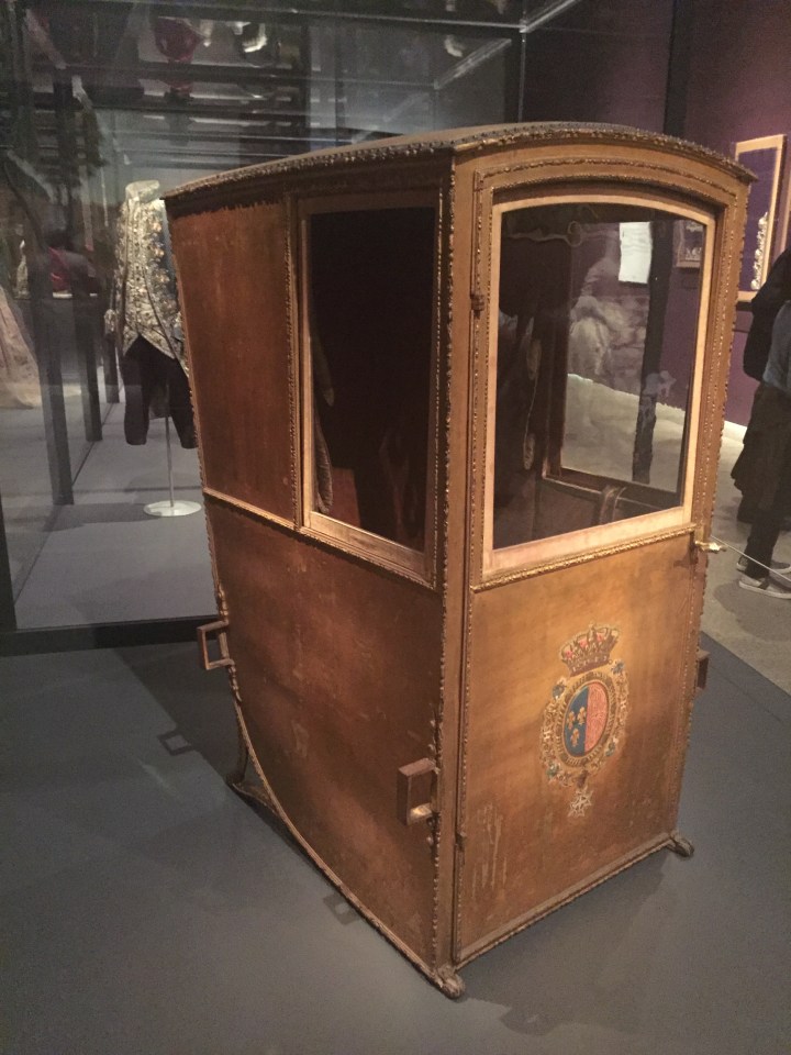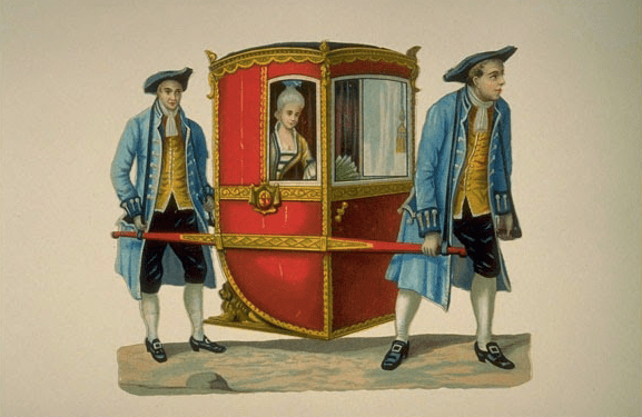 The above sedan chair was made in France around 1783 and is typical of those used around Versailles to transport people the way we would use a taxi today. Characterized by its elegant, restrained outline, this particular portable chair bears the coat of arms of France and Navarre encircled by the chain of the Order of the Holy Spirit. It would have carried courtiers or members of the royal family. Visitors could also make use of sedans, the so-called chaises blues (blue chairs) named for the color of the porters’ uniforms, for travel within the town of Versailles and to the palace. If you’re perplexed how a sedan chair was used, the image below should help you out.