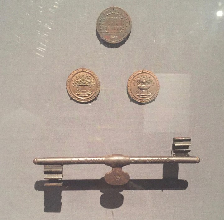 As I mentioned, the majority of Versailles’ gardens were accessible to the general public, except for the fenced-in groves which were locked to protect against vandalism. To access the groves, one had to know someone in possession of a key. The Master Key, shown below the tokens in the photograph, was made in France between 1760 to 1774. This key and ones like it, were used to open those special spaces. As a writer of historical fiction, I naturally wonder what people would have done to gain possession of such a key and what exactly went on in those private spaces.