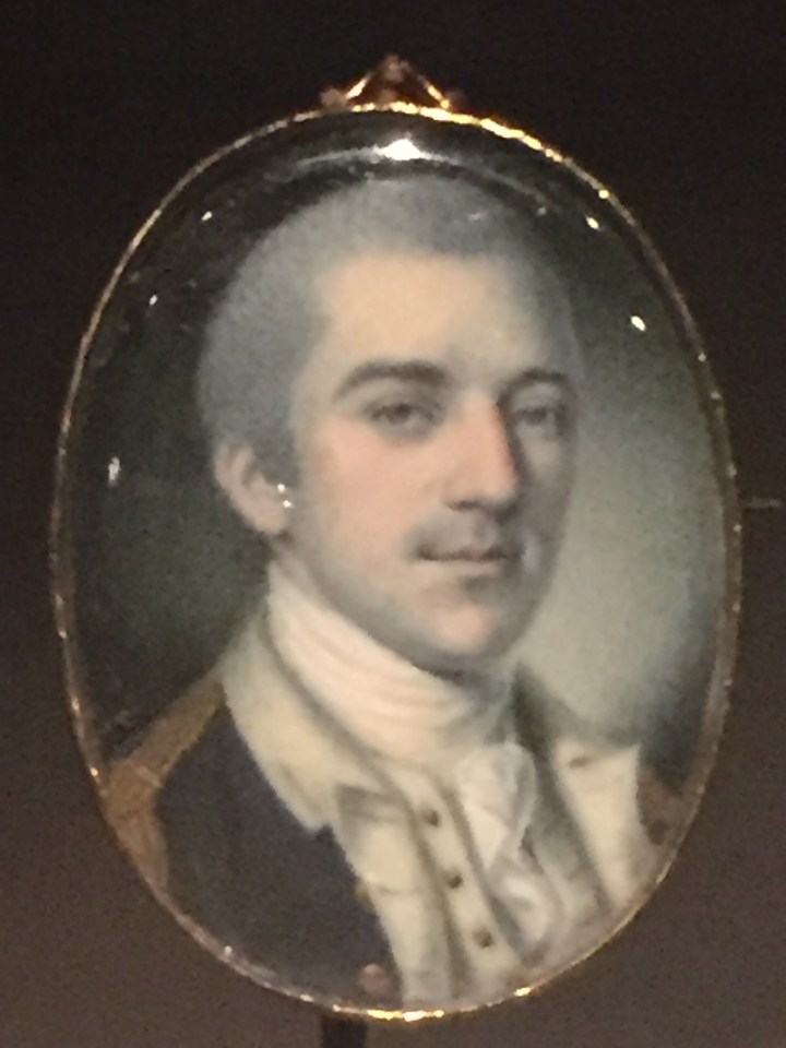 Allow me to introduce you to Colonel John Laurens, aide-de-camp to George Washington during the Revolutionary War. If you are familiar with the musical Hamilton, you already know his story. This miniature portrait of him in his military uniform was painted by American artist Charles Wilson Peale in 1780. In 1780 the Continental Congress named Laurens a special envoy to France to help Benjamin Franklin secure additional support for the American cause. According to the information in the exhibition, Laurens spoke excellent French and was untiring in his mission, but his bluntness ruffled a few feathers at court. Nevertheless, his determination ultimately paid off. In 1781, Laurens obtained France’s commitment to station a fleet off the American coast, enabling Washington’s army to defeat the British forces at Yorktown.