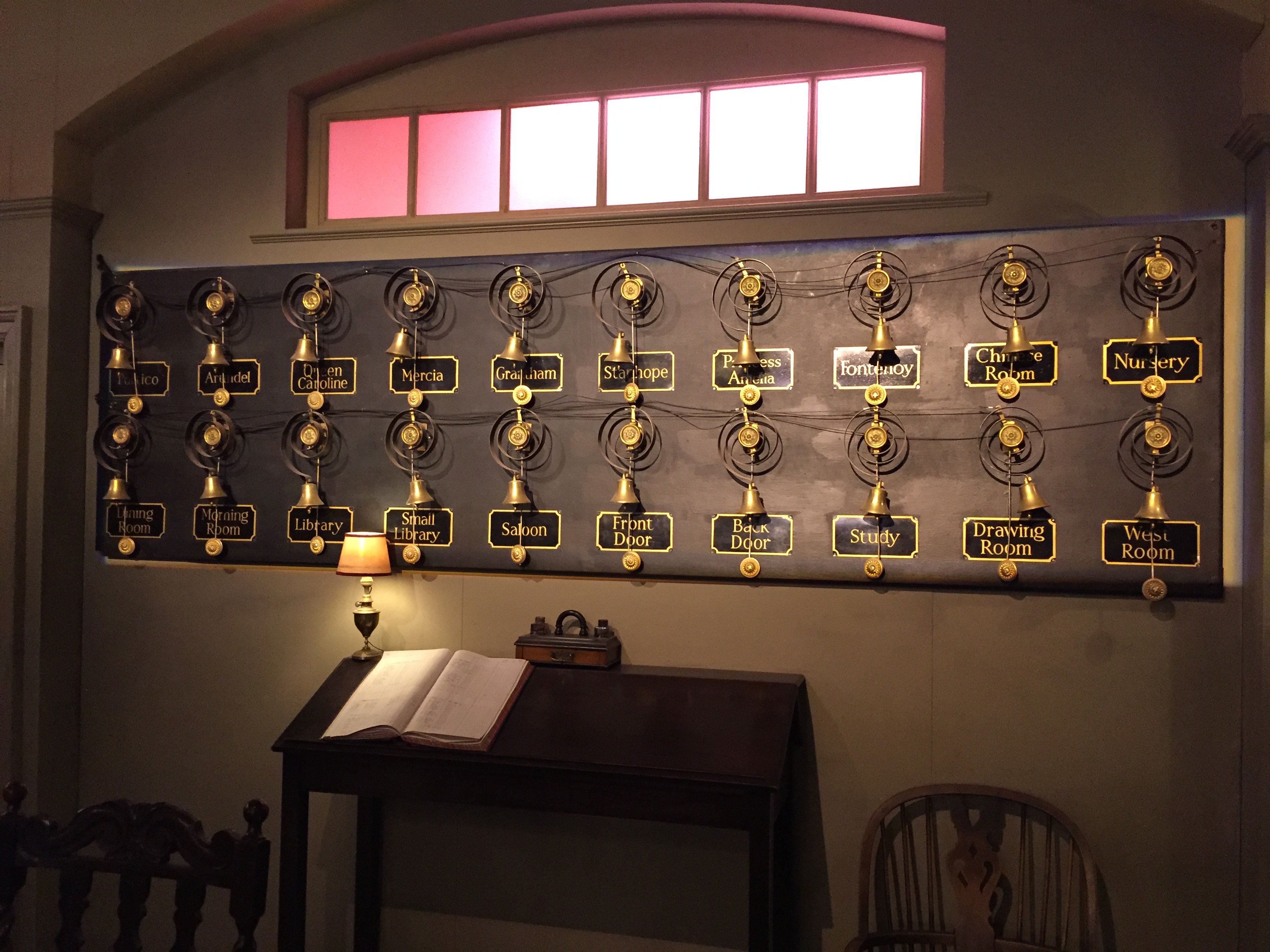 This is the bell board. A bell would ring each time someone pulled the bell pull in one of the rooms of the house to summon a servant. Can you imagine having to learn the sound of each of these bells to let you know what room you needed to go to?